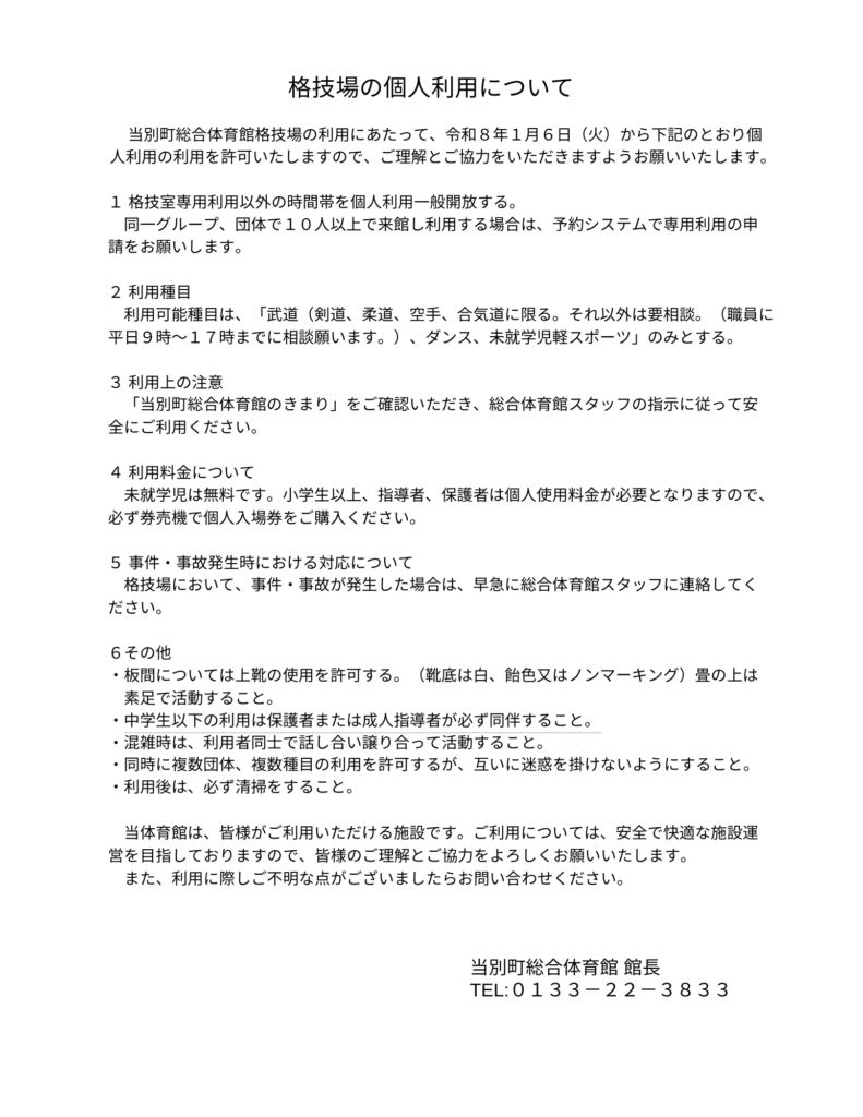 令和8年1月6日(火)より、格技場を個人でもご利用いただける「種目限定一般開放」を実施いたします。